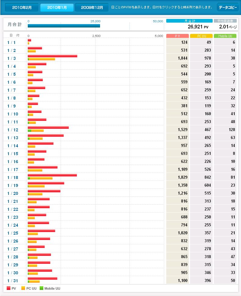 例えば、ホリエモンのブログは12300人、池田信夫ブログは7500人のGoogleリーダー登録者がいます。こういった、アルファブロガーの方でなくとも、やはり優良なエントリを書かれている方はGoogleリーダーの登録数が1000を超えます。はてブやプロモーションで一時的なPVを稼ぐよりはRSSリーダーで定期購読してくださる人のほうが、ブログの価値を判断するのに適切だろうと感じます。12月末の段階で11人だったGoogleリーダーの登録者数が、1月末の段階で146人に増えていました。これは本当に有り難いことだなと思います。その常連客の増加は毎日のアクセス数にも現れていて、1月前半は、200前後だったアクセス数が、1月後半は350前後に大幅に改善しています。はてブなどで取り上げられることで、一時的に爆発的なアクセスが稼げることもあるのですが、実際はリピーターの期待を裏切らないことのほうがより重要だと思うわけです。