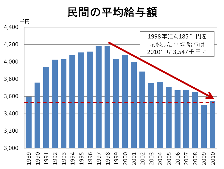 このデータによると、1998年のピーク時を境に民間の平均給与額は下がり続けている。